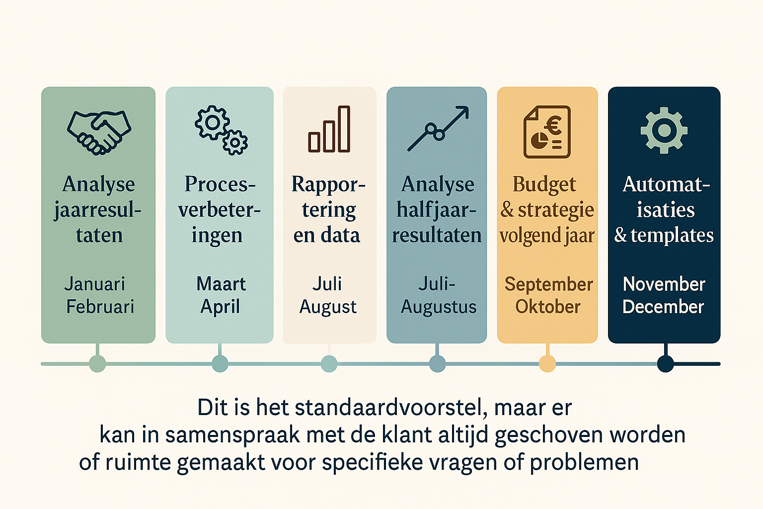 We vertrekken vanuit een basisjaarplanning met vaste thema's per kwartaal of maand, zoals: