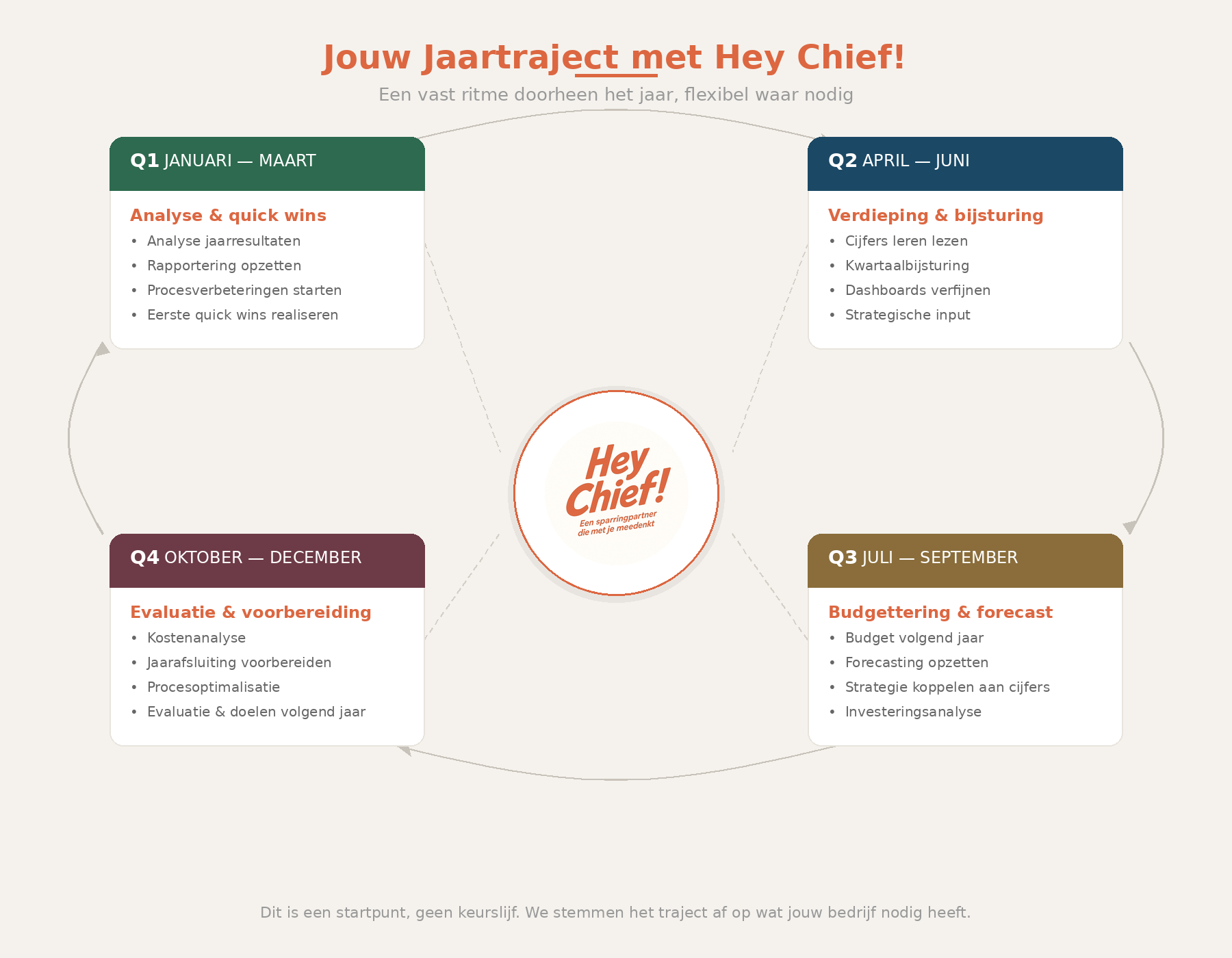 Het ankerpunt is een jaartraject op abonnementsbasis: maandelijks vaste tijd voor jouw bedrijf, afgestemd op jouw ritme en noden. We vertrekken vanuit een basisjaarplanning met vaste thema's, zoals analyse van je jaarresultaten en procesverbeteringen aan het begin van het jaar, kwartaalbijsturingen doorheen het jaar, en budgettering en voorbereiding richting jaareinde. Tussendoor spelen we flexibel in op wat zich aandient, van ad hoc vragen tot nieuwe inzichten of projecten.